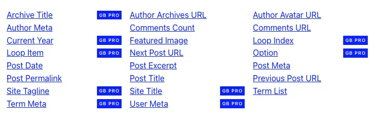 Link til den engelske version af dokumentationen til Dynamic Tags fra GenerateBlocks her.