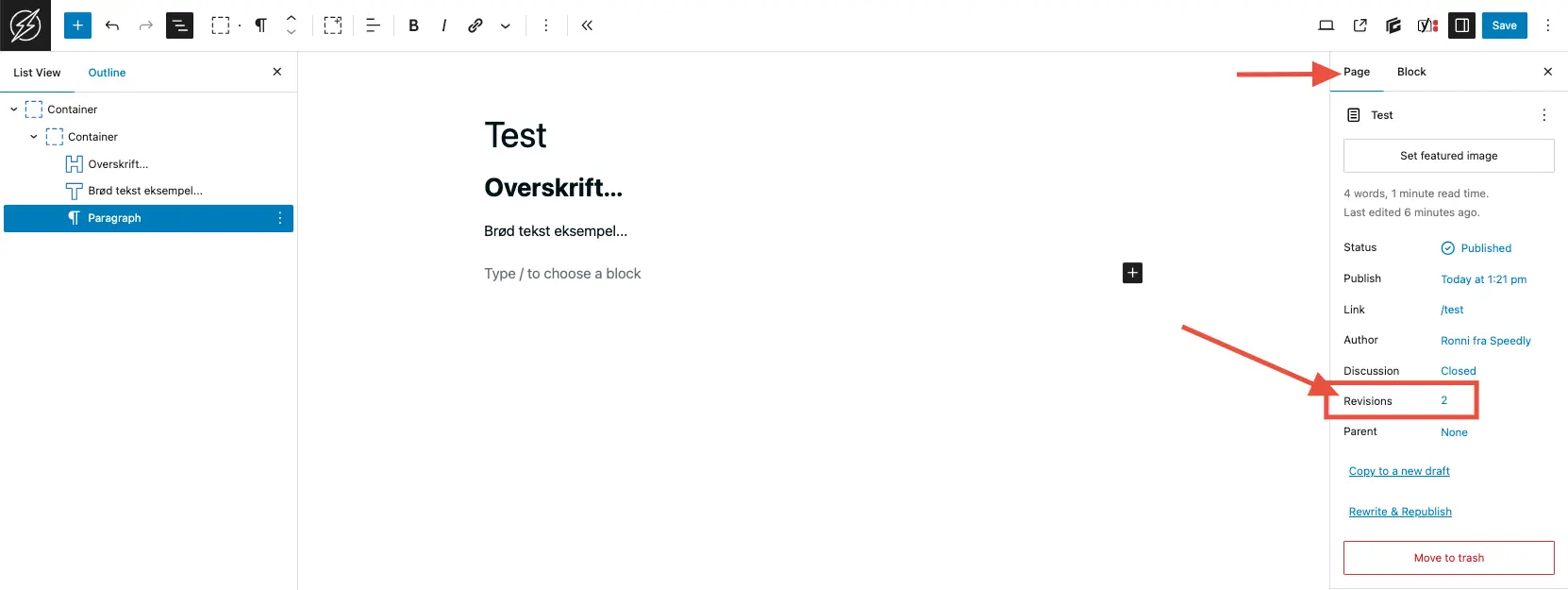 - Brug Revisions når du hurtigt vil gendanne en tidligere version af en side eller et indlæg.