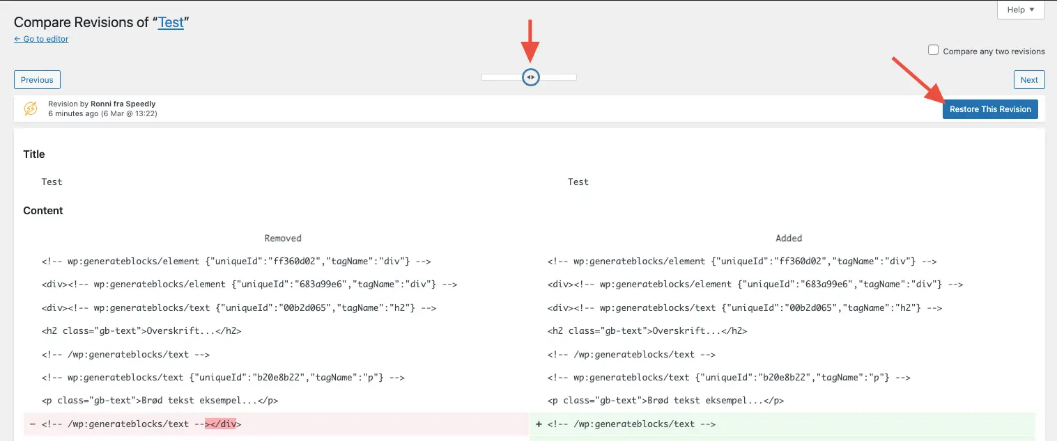 - Når du har fundet den ønskede version, klik på “Gendan denne revision“.