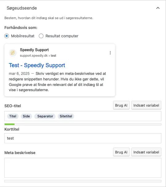 Når du redigerer SEO-titlen i Yoast SEO, vil du også se en korttitel (også kaldet slug). Dette er den del af URL’en, der bruges til at identificere din side (f.eks. din-hjemmeside.dk/landingsside).